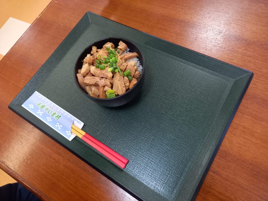 八重山そばに入っている味の染みた三枚肉がたっぷりご飯にのっていました!